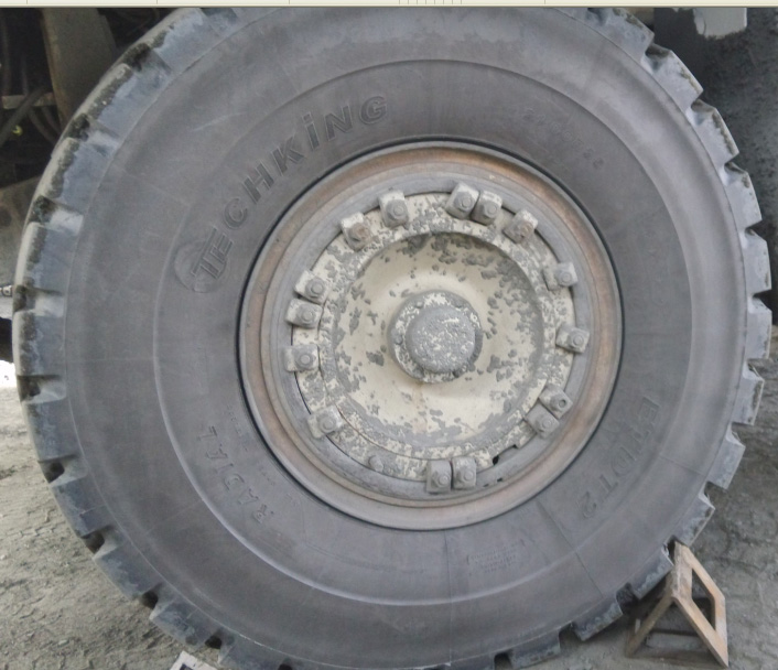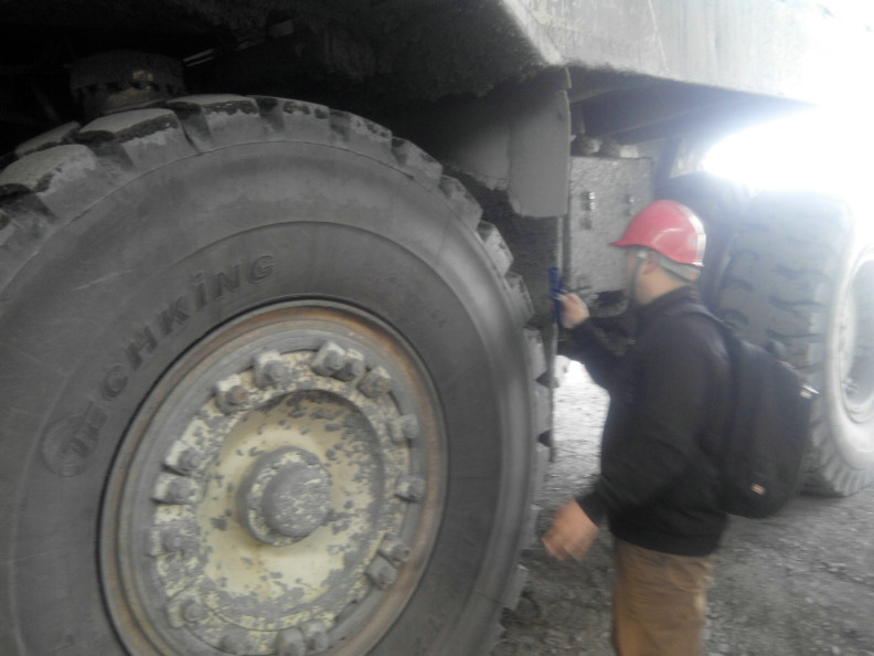 在钼矿项目现场,倪总协调生产副总孙总带领泰凯英考察人员对该矿区采运路况、剥离采运规模、行驶坡度、运距、车速、车辆运行状况、废胎区、年度温度环境等数据进行调研了解,并重点对TR50刚性卡车和陕汽中集宽体车进行调研。在车辆休息区和维修站,考察人员上车考察,重点对标配21.00R35轮胎进行检查、胎压监测、测量数据、病象分析。经调研发现该矿车辆管理非常规范,杜绝了超速超载的现象,车队管理和轮胎维修也较完善较规范。但该矿的装载区和卸料区路面非常恶劣,布满尖石,该车队轮胎大部分的病象均为扎伤、划伤。